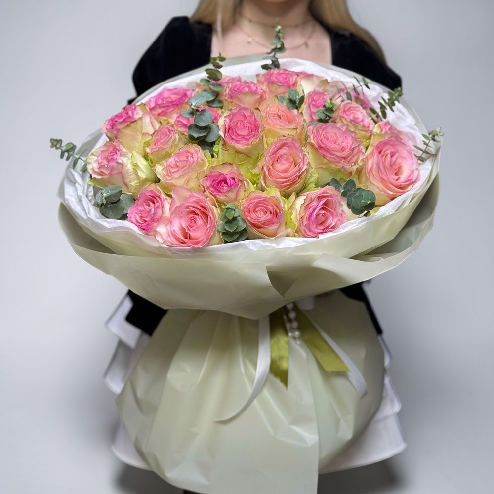 Роза-25 Эвкалипт-2 Оформление-1 Обращаем Ваше внимание, что некоторые цветы в букете могут быть заменены из-за отсутствия в наличии или их несезонности.